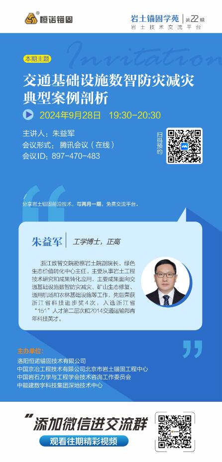 巖土錨固學(xué)苑是由洛陽恒諾錨固技術(shù)有限公司、中國京冶工程技術(shù)有限公司北京市巖土錨固工程中心、中國巖石力學(xué)與工程學(xué)會技術(shù)咨詢工作委員會和中能建數(shù)字科技集團(tuán)深地技術(shù)中心聯(lián)合舉辦的線上交流研討會,兩月一期邀請行業(yè)內(nèi)不同專家學(xué)者線上分享巖土錨固的技術(shù)、工藝、產(chǎn)品、應(yīng)用等,旨在為廣大巖土領(lǐng)域人士提供免費(fèi)的學(xué)習(xí)平臺,增進(jìn)巖土錨固專家、學(xué)者、從業(yè)人員之間的互動交流。