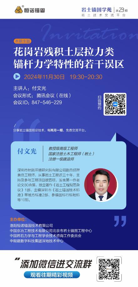 巖土錨固學苑是由洛陽恒諾錨固技術有限公司、中國京冶工程技術有限公司北京市巖土錨固工程中心、中國巖石力學與工程學會技術咨詢工作委員會和中能建數字科技集團深地技術中心聯合舉辦的線上交流研討會,兩月一期邀請行業(yè)內不同專家學者線上分享巖土錨固的技術、工藝、產品、應用等,旨在為廣大巖土領域人士提供免費的學習平臺,增進巖土錨固專家、學者、從業(yè)人員之間的互動交流。