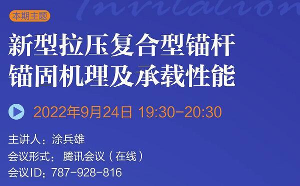 發(fā)布日期:2022-09-26 10:51巖土錨固學苑將于2022年9月24日(周六)19:30-20:30舉辦第5期,本期主題:新型拉壓復合型錨桿錨固機理及承載性能,歡迎廣大巖土錨固領域愛好者參與交流。...