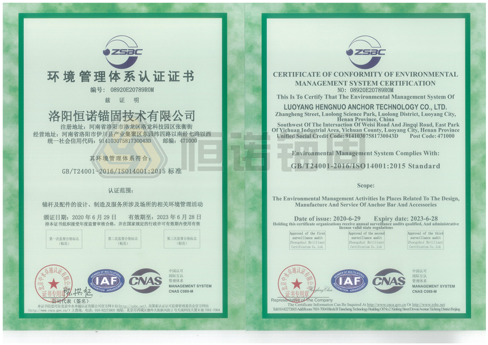 發(fā)布日期:2020-06-24 18:352020年6月29日,洛陽(yáng)恒諾錨固技術(shù)有限公司順利通過(guò)ISO14001:2015“環(huán)境管理體系認(rèn)證”及ISO45001:2018“職業(yè)健康安全管理體系認(rèn)證”。ISO14001環(huán)境管理體系認(rèn)證,是指依據(jù)I......