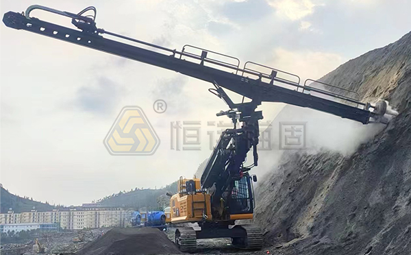 高舉鉆機舉升高度在9-40米,采用整體集成結(jié)構(gòu),由行走系統(tǒng)、動力系統(tǒng)、液壓操控系統(tǒng)、舉升系統(tǒng)和鉆進系統(tǒng)五大部分組成。高舉鉆機可以搭配不同動力頭,用以匹配不同施工工藝的鉆進施工,如潛孔鉆進、跟管鉆進、螺旋鉆進、頂錘方式鉆進等。高舉鉆機主要適用于鐵路、公路、水電站等大型高邊坡支護、危巖體加固工程,或大型隧道工程施工使用。