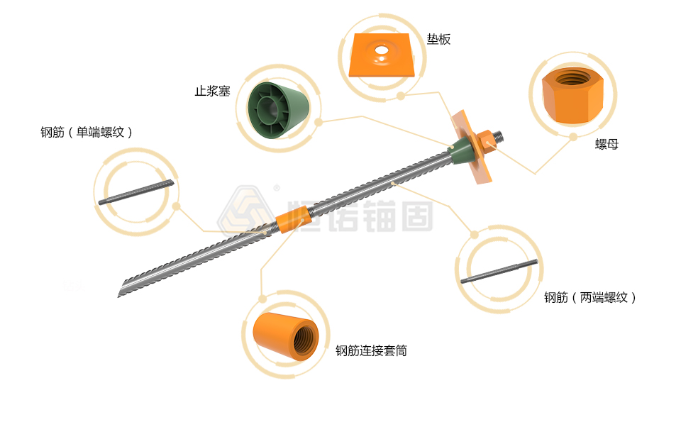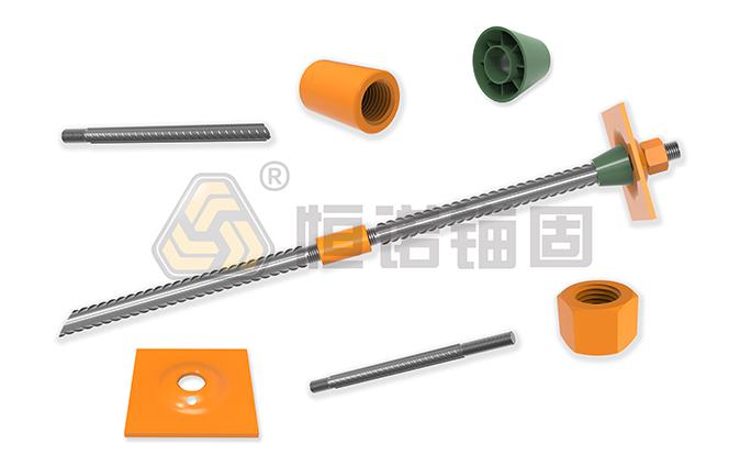 熱軋帶肋鋼筋錨桿選用的熱軋帶肋鋼筋符合國家現(xiàn)行標準GB/T 1499.2-2018《鋼筋混凝土用鋼第2部分:熱軋帶肋鋼筋》,端部螺紋采用滾壓工藝軋制成型,由鋼筋錨桿體、螺母、墊板、連接套(選用)組成,公稱直徑宜為22mm~32mm,型號包含M22、M25、M32三種。